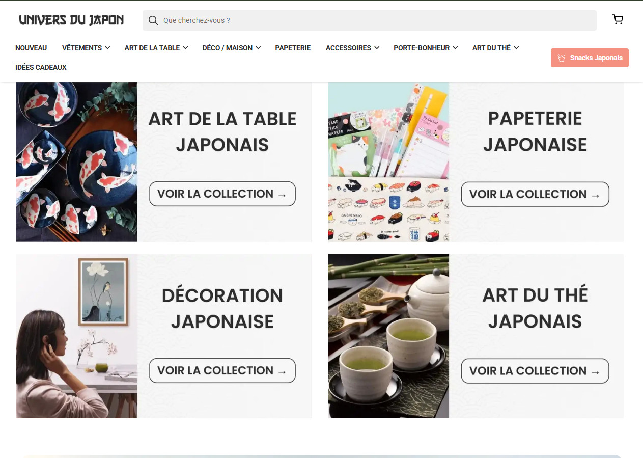 Universdujapon.com est une boutique en ligne spécialisée dans les produits inspirés de la culture japonaise. Lancée en 2018, la plateforme propose un catalogue varié d’articles liés au Japon, allant de la décoration aux vêtements traditionnels, avec pour objectif de rendre l’univers et les traditions japonaises accessibles au plus grand nombre.